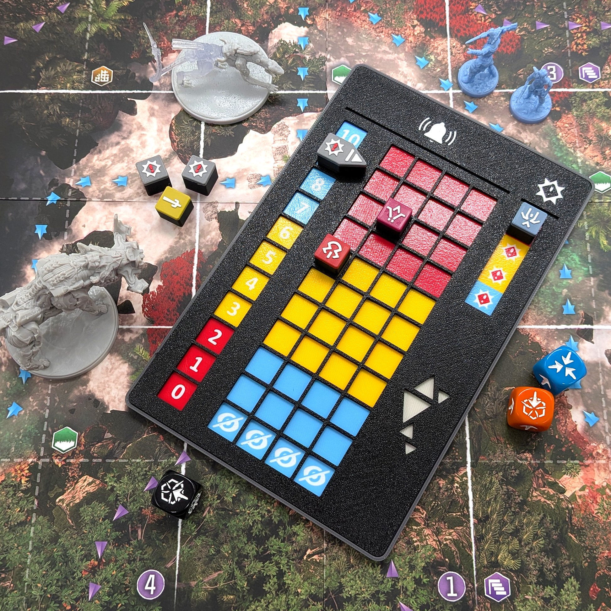 Smooth design: Individual slots in the alert tracker make sure that your tokens don’t slide around when you move single player tokens, while the threat tracker is a single slot to easily swap the order of players and slide them up or down.